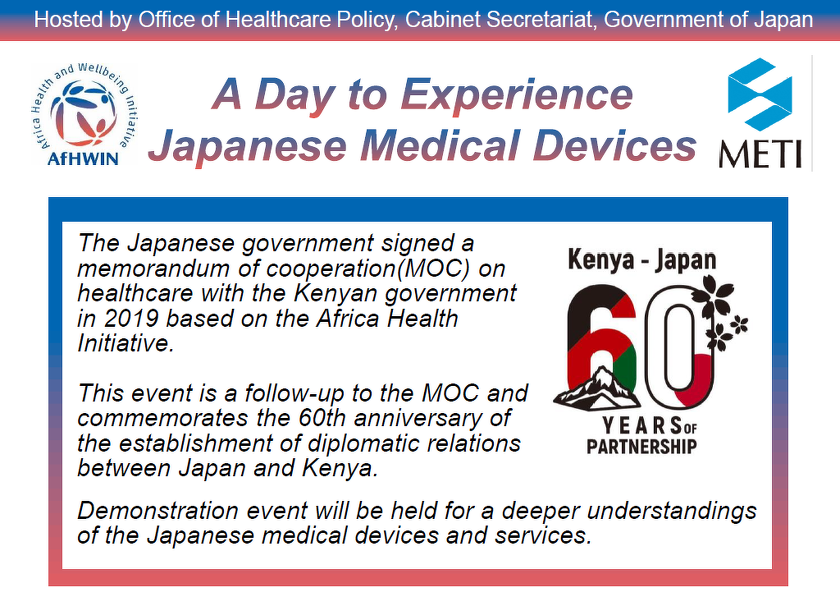 This event commemorates the 60th anniversary of the establishment of diplomatic relations between Japan and Kenya, and will introduce Japanese medical devices and services from all over Japan.